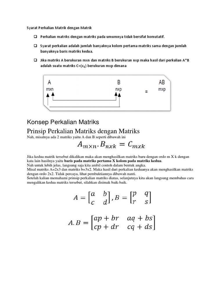 Dan selanjutnya baris kedua matrik a dengan matriks b kolom ke 2, selanjutnya begitu. Selain membahas tentang rumus perkalian matriks kami juga akan membahas secara singkat rumus perkalian skalar matriks, untuk lebih jelasnya silahkan simak penjabaran. Operasi hitung pada matriks meliputi operasi penjumlahan, pengurangan, dan perkalian matriks, perkalian matriks yang akan diulas adalah perkalian matriks dengan skalar dan operasi hitung perkalian antar dua matriks, serta sifatnya. Website pribadi muhammad muntaza bin hatta, untuk menampung catatan harian yang bersifat teknis dan catatan non teknis lainnya. Jika dan bilangan r = 2, maka: